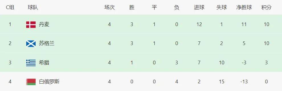 两队都是3胜1平积10分。当然,丹麦净胜球多一些,11个。而苏格兰只有5个。但丹麦主场和苏格兰打成0:0,双方难分高下,而且苏格兰客场拿1分,客观上还是稍占一些主动。所以对冲之下,两队更难看出谁更有优势了。