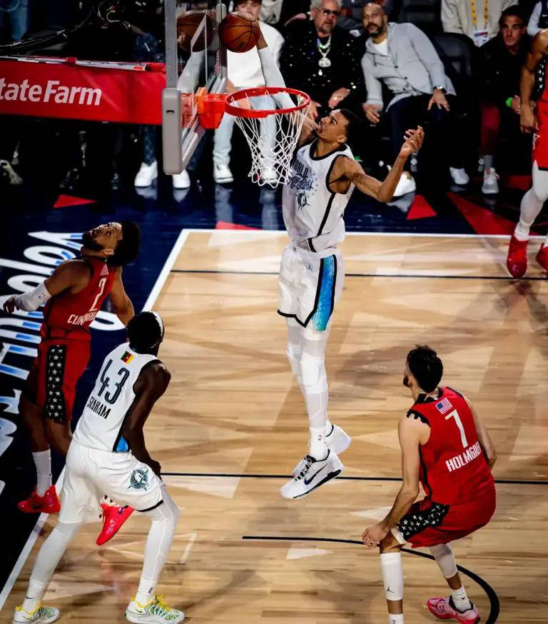同样身为队友的以色列前锋阿夫迪亚也公开称赞了维克托·文班亚马。这位2023届状元秀在全明星赛上展现出了强烈的竞技欲望和出色的终结能力,获得了队内外一致好评。与此同时,加拿大后卫穆雷面对文班亚马的风采多少处于尴尬境地,而同属美国队的多诺万·米切尔则评价说:“坦白讲,我比赛时主要在热身,没太关注场上细节,但凭借上个赛季与他共事的经验,我知道他必然会带动节奏,勇于挑战所有人,并且提升全场气氛。”