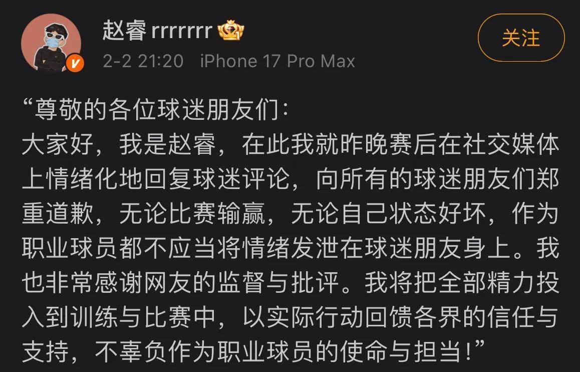眼看收不了场,2月2号晚上,赵睿的道歉来了。 他在微博上发了一封手写的道歉信,字迹工工整整。 信里是这么说的:“尊敬的各位球迷朋友们:大家好,我是赵睿,在此我就昨晚赛后在社交媒体上情绪化地回复球迷评论,向所有的球迷朋友们郑重道歉。 ”他承认,不管比赛输赢,自己状态好坏,作为职业球员都不该把情绪撒到球迷身上。 他还感谢了网友的监督,保证以后会把所有精力放回训练和比赛里。 道歉是道了,但很多网友不买账,觉得他信里只提“情绪化”,对那句“打馕”的实质影响避重就轻,诚意不够。 也有人翻旧账,说这可不是赵睿第一回失控了,2025年他就因为冲撞裁判被停赛过5场。 这道歉,到底能不能真正平息争议,眼下还真不好说。